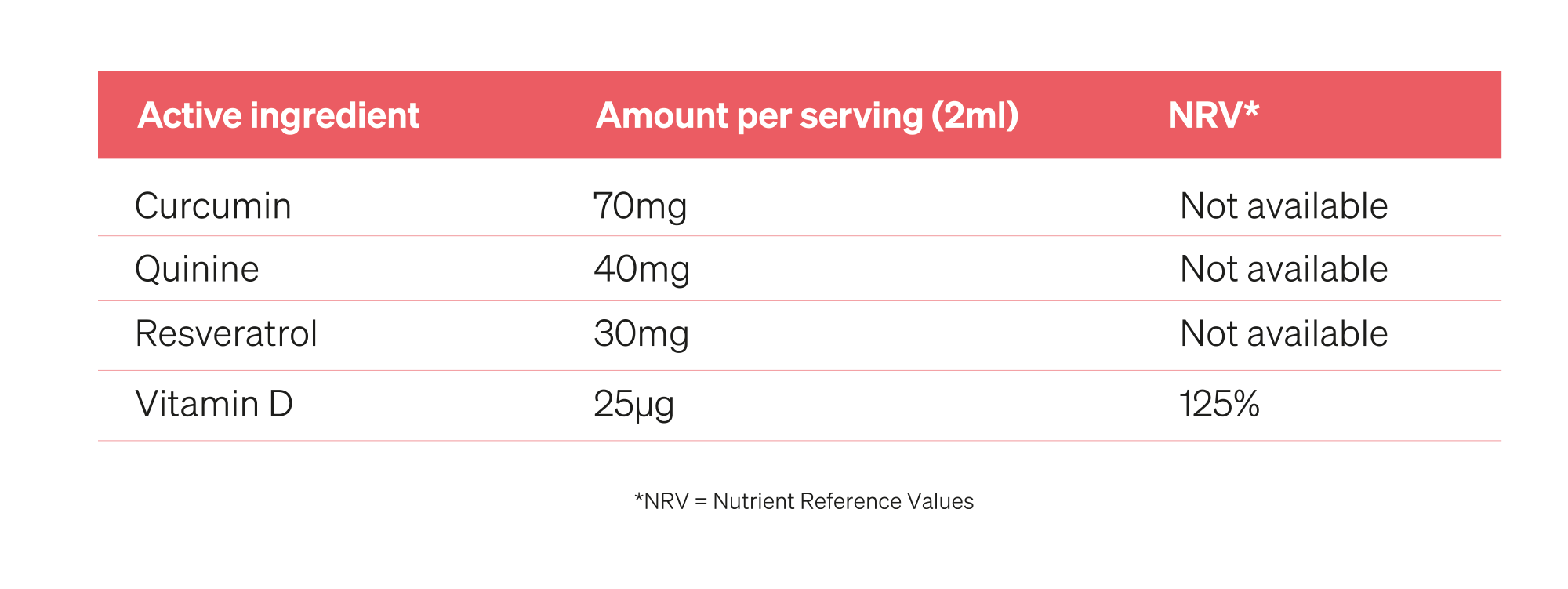 Our science team has designed a formulation of super-pure natural ingredients with powerful bioactive properties – including Vitamin D3, curcumin, resveratrol, ginger and quinine.